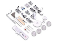 Piedino standard, Piedino per cerniere, Piedino per asole, Piedino per punto satin, Piedino per cucire bottoni, Piedino sopraggitto, Piedino orlo invisibile, Piedino orlo arrotolato, Piedino arricciatore, Guida bordo/trapunta, Apriasola/Scucitore/Spazzolina, Confezione di aghi (# 11, # 14, # 16), Fermaspola grande, Fermaspola piccolo, Spoline (4x), Cacciavite a L, Copertina morbida, Tavolo allungabase.