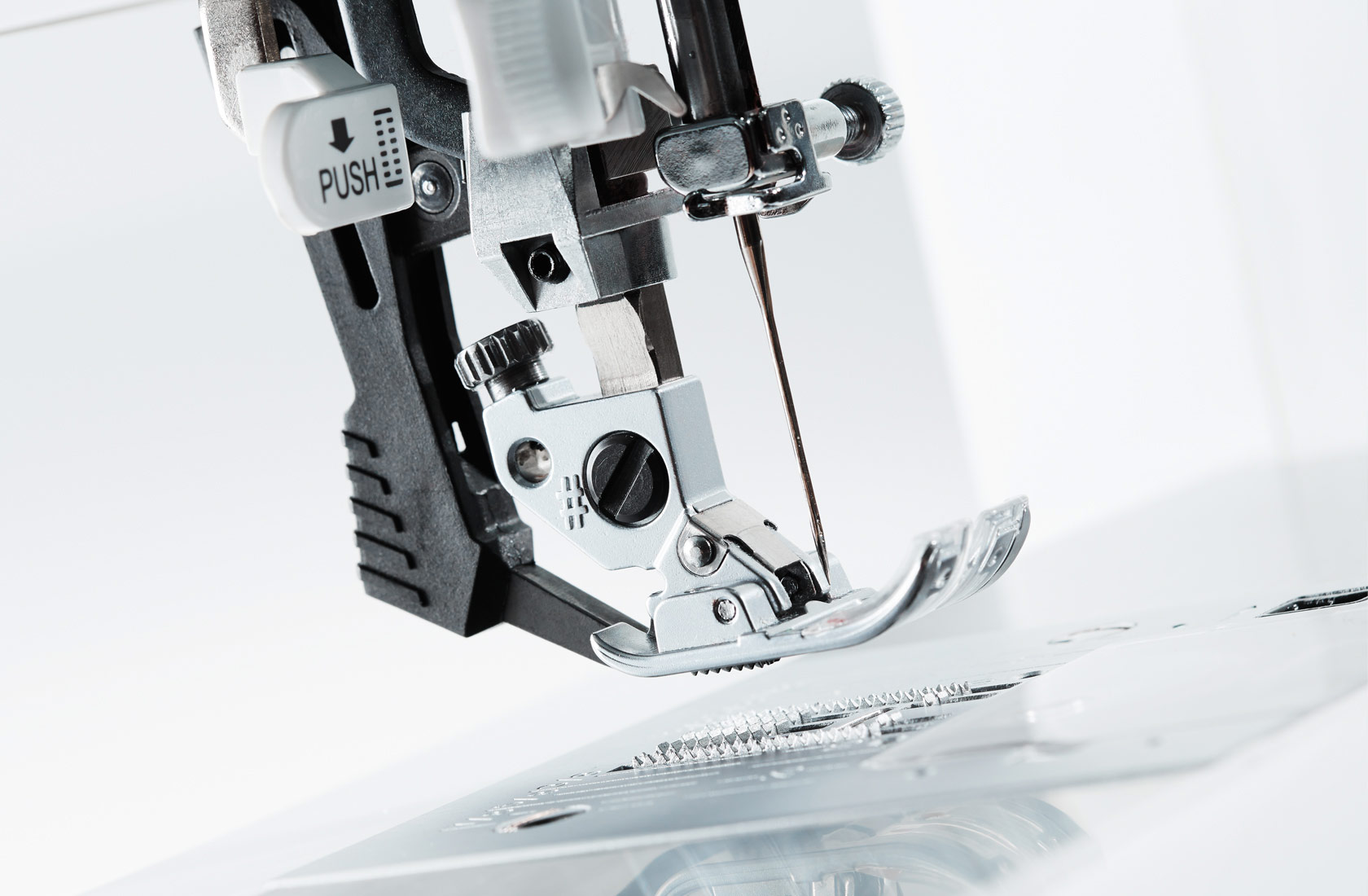 Prendi completo controllo di ogni punto per qualsiasi progetto. Regola semplicemente la velocità, la tensione del filo e la pressione del piedino come desideri se usi tecniche speciali o tipi diversi di tessuto. Il piedino con alzata extra e la potenza elettronica di perforazione sono ideali per tessuti spessi e molteplici strati.