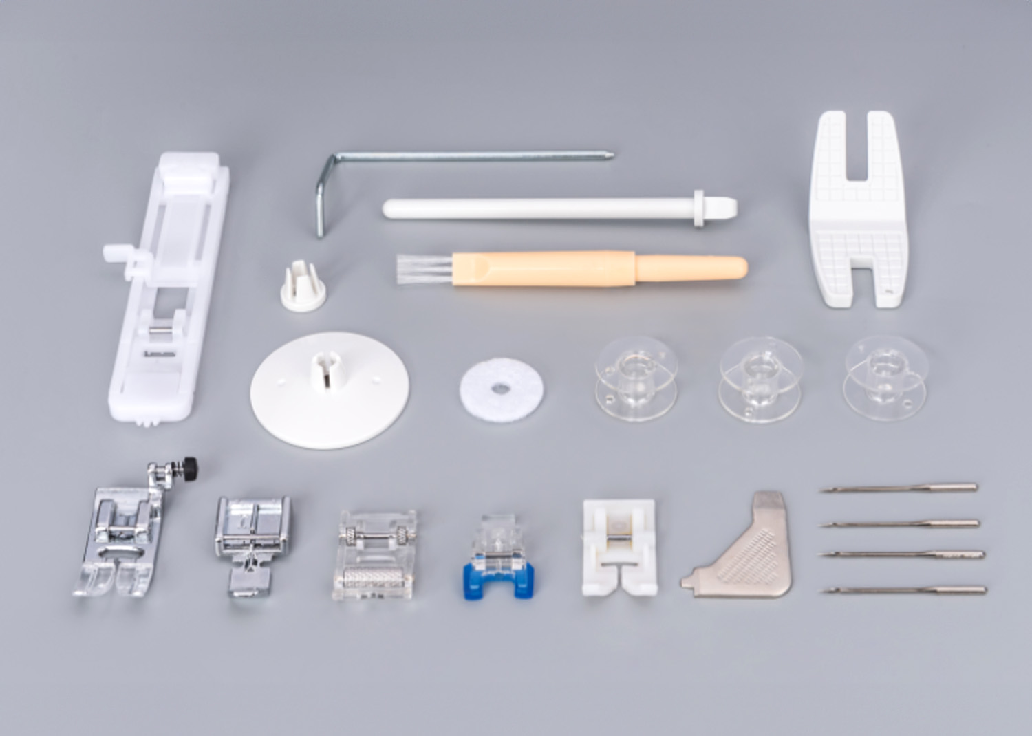 Piedino universale, Asola in 1 tempi, Piedino per cerniere, Piedino per bottoni, Piedino anti attrito, Piedino a rullo, Supporto per jeans, Guida bordo/trapunto, Cacciavite a l, Confezione di aghi, Spoletta, Scuci asola / spazzolina, Porta rocchetto ausiliario, Ferma rocchetto, Ferma anti-scivolo rocchetto, Copertina antipolvere