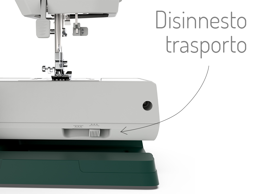 Attraverso una comoda manopola posta su fronte macchina, realizza in modo impeccabile 21 punti suddivisi tra punti utili, elasticizzati, decorativi, regolabili in lunghezza e larghezza ed asola automatica a 4 tempi. Per disinserire il trasporto basta un semplice gesto, funzione molto apprezzata da chi ama ricamare a mano libera, trapuntare o semplicemente attaccare bottoni e paillettes.