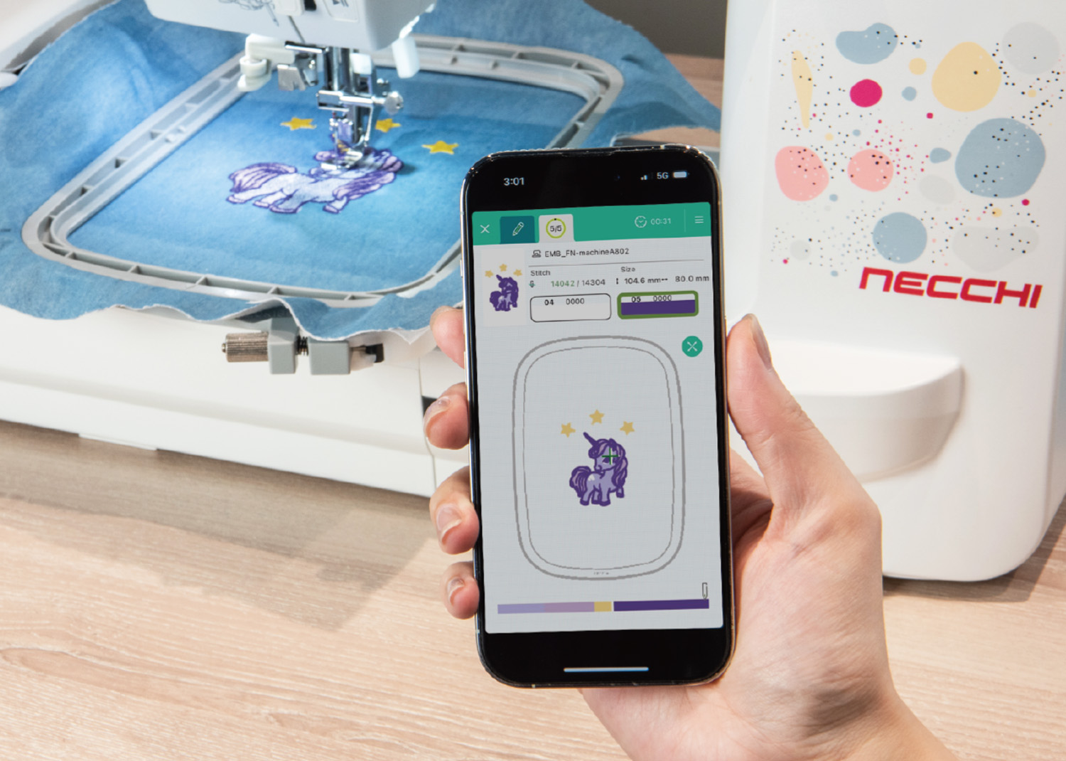 Con l’app per dispositivi mobili e il programma per computer, gestisci e trasferisci i tuoi ricami direttamente via WiFi. Crea, modifica e organizza i tuoi disegni ovunque ti trovi, per un’esperienza creativa sempre connessa.