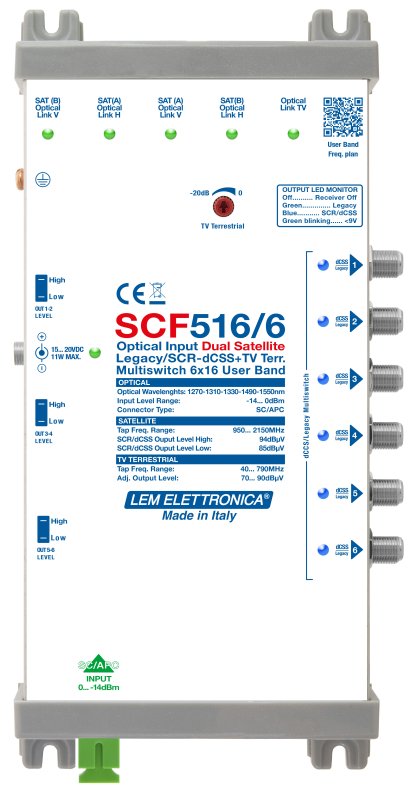 Multiswitch ad ingresso ottico con 6 uscite Legacy/dCSS per la distribuzione di tutti i transponders satellitari di due posizioni orbitali e dei servizi terrestri DVB-T/T2, FM, DAB tramite una singola fibra monomodale.