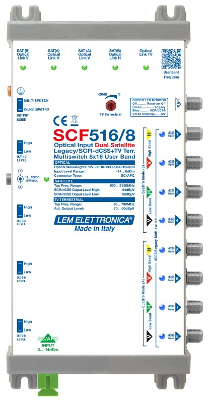 Multiswitch ad ingresso ottico con 8 uscite Legacy/dCSS per la distribuzione di tutti i transponders satellitari di due posizioni orbitali e dei servizi terrestri DVB-T/T2, FM, DAB tramite una singola fibra monomodale.