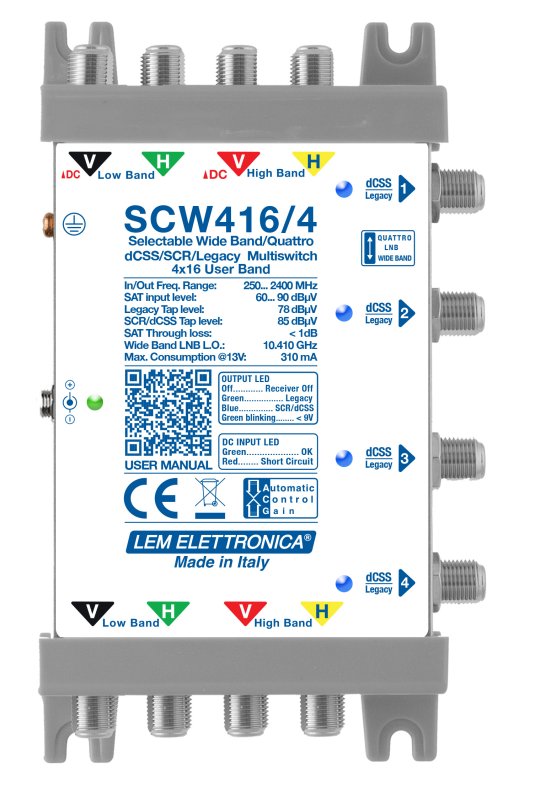 Multiswitch a 4 uscite derivate per distribuzioni in cascata di soli segnali satellitari. Adatto alla realizzazione di nuovi impianti o ad essere integrato in impianti pre-esistenti realizzati con LNB Quattro. Può essere configurato per operare con LNB di tipo Wide band rendendo possibile una distribuzione completa di un singolo satellite con solo 2 cavi coassiali oppure due satelliti con 4 cavi.