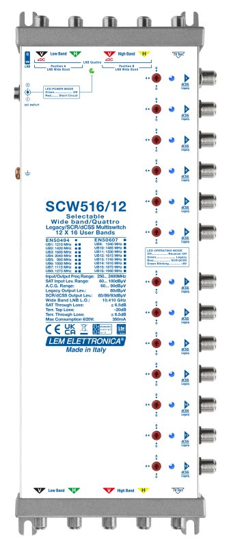 Multiswitch Ibrido a 5 cavi Legacy/SCR-dCSS con miscelazione TV terrestre. Ingressi per LNB Quattro/WideBand.