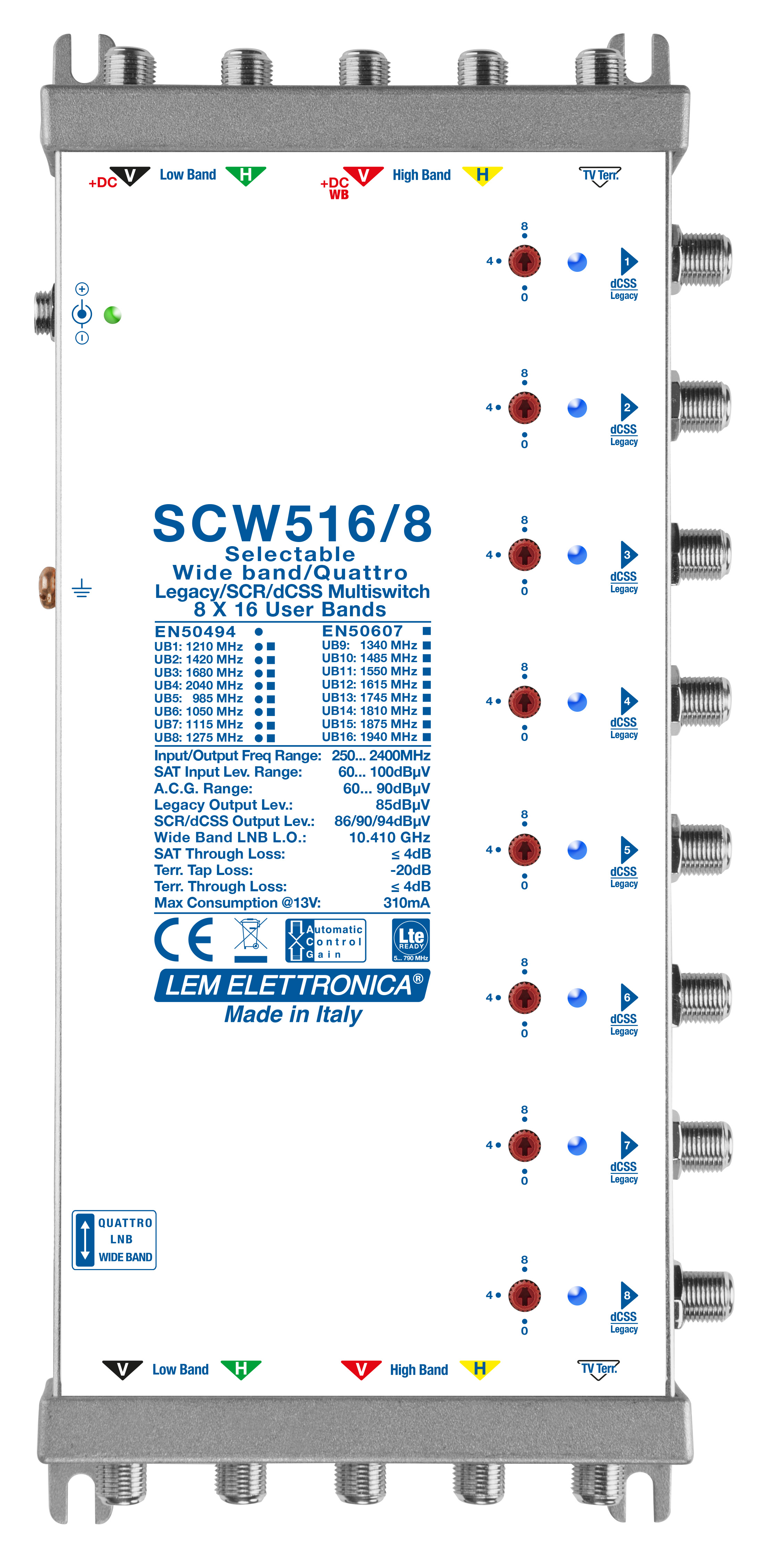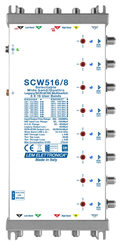 Multiswitch Ibrido a 5 cavi Legacy/SCR-dCSS con miscelazione TV terrestre. Ingressi per LNB Quattro/WideBand.
