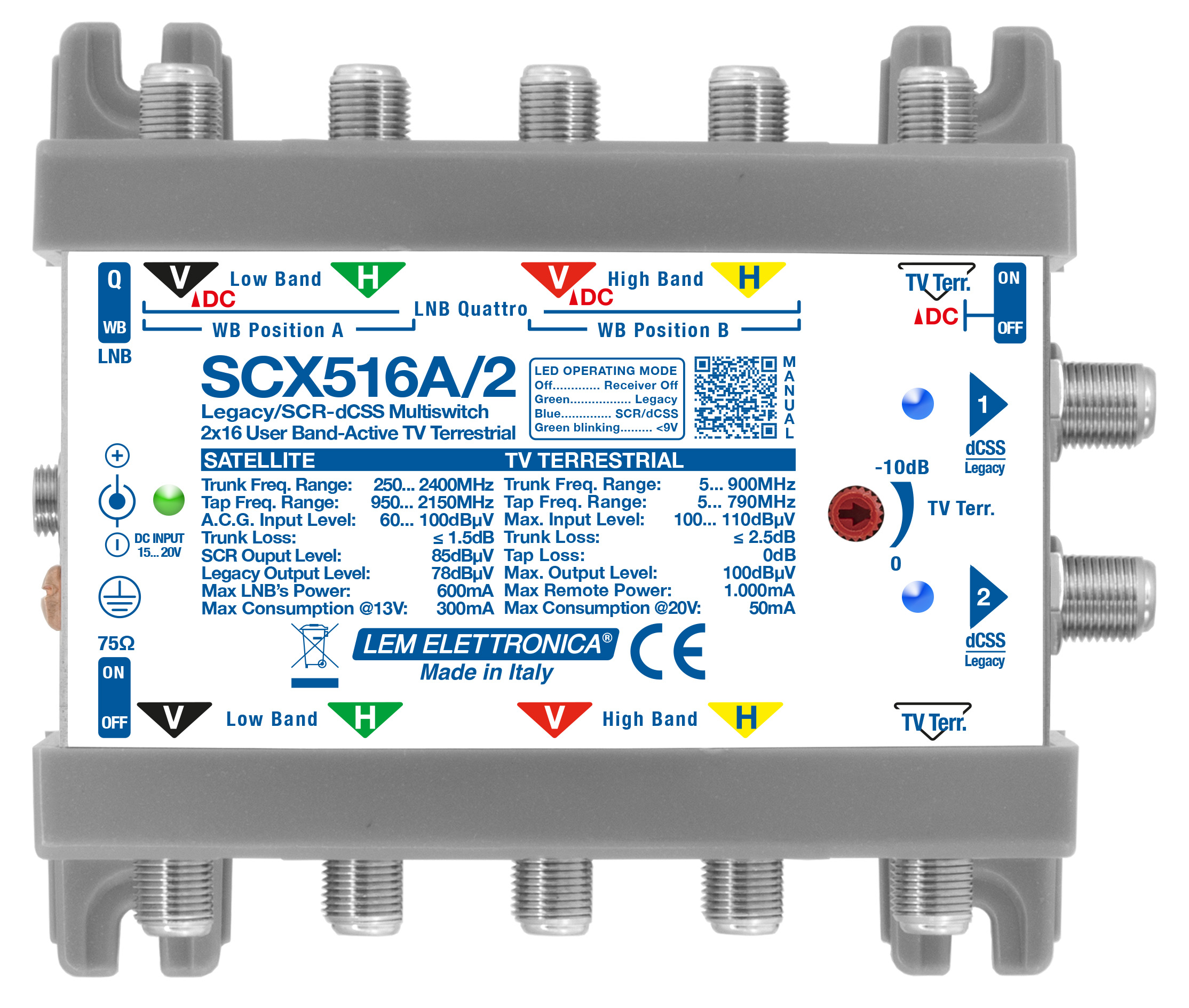 Multiswitch ibridi a 5 cavi con miscelazione TV terrestre attiva e 16 User Band SCR/dCSS per uscita. Ingressi per LNB WideBand/Quattro con Controllo Automatico del Guadagno.