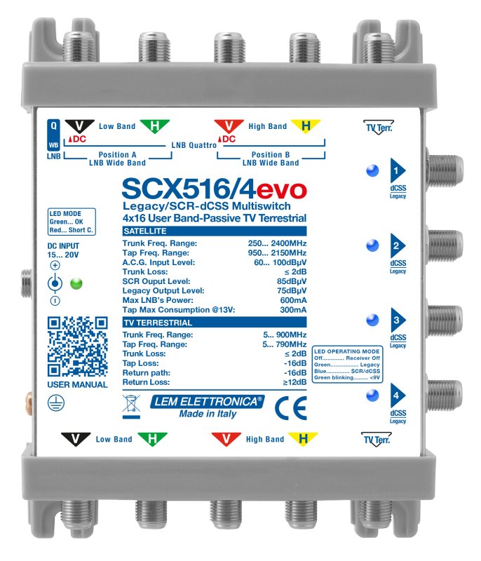 Multiswitch Ibrido a 5 cavi Legacy/SCR-dCSS con miscelazione TV terrestre. Ingressi per LNB Quattro/Wide Band.