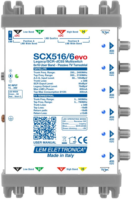 Multiswitch Ibrido a 5 cavi Legacy/SCR-dCSS con miscelazione TV terrestre. Ingressi per LNB Quattro/Wide Band.