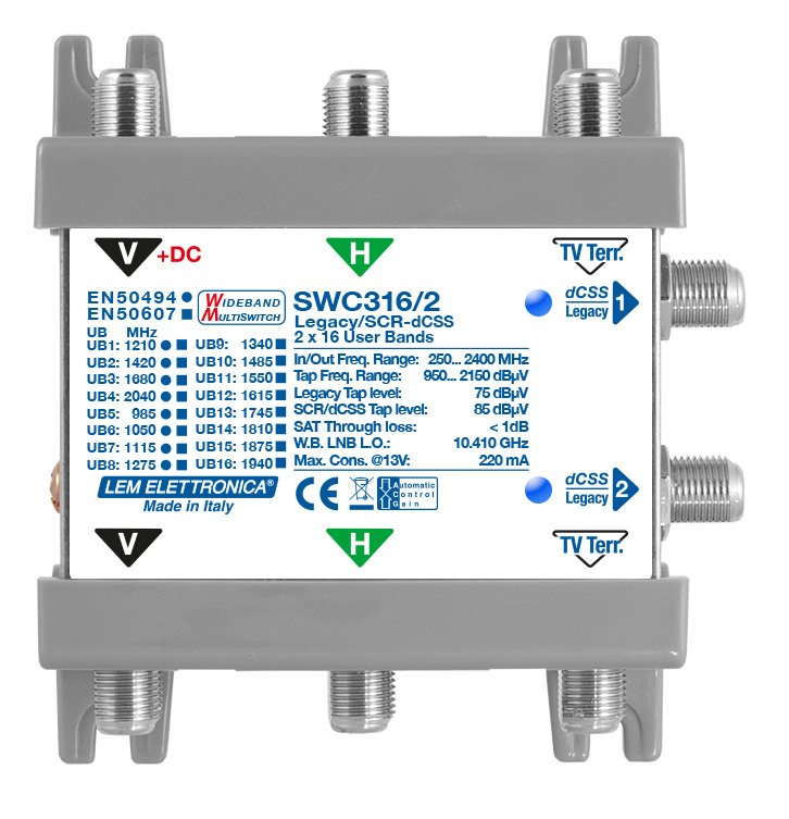 Multiswitch in cascata Wide band a 2 uscite derivate, per la realizzazione semplificata di impianti per la distribuzione di tutti i transponder di un singolo satellite mediante l’ultilizzo di due soli cavi coassiali.