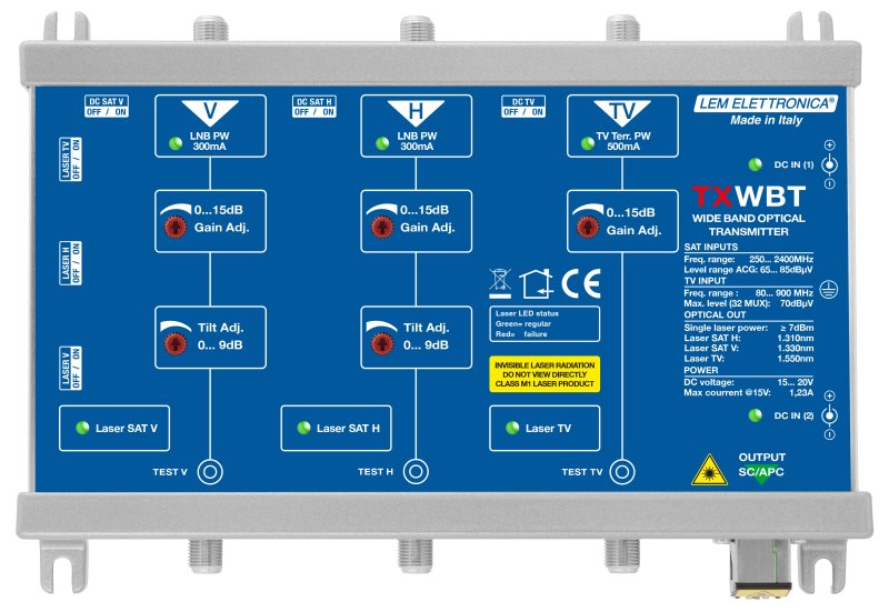 Trasmettitore ottico a tre lunghezze d’onda per realizzare con una singola fibra ottica monomodale distribuzioni di un’intera posizione orbitale e TV digitale terrestre e i servizi radio FM e DAB.