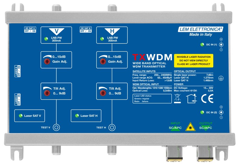 Trasmettitore ottico a due lunghezze d’onda con ingresso CWDM integrato. Adatto ad essere utilizzato in aggiunta a un trasmettitore TXWBT o TXWB per realizzare distribuzioni con una seconda posizione orbitale satellitare mediante una singola fibra ottica monomodale.