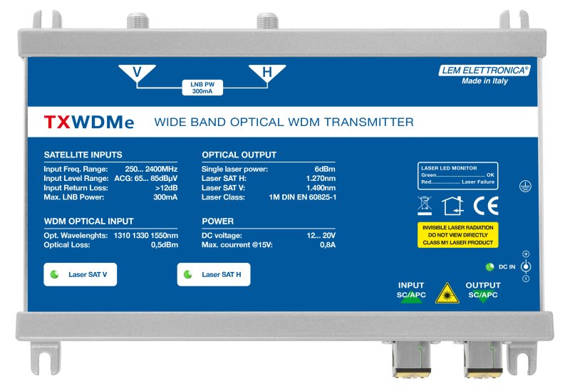 Trasmettitore ottico a due lunghezze d’onda con ingresso CWDM integrato. Adatto ad essere utilizzato in aggiunta a un trasmettitore TXWBTe o TXWBe per realizzare distribuzioni con una seconda posizione orbitale satellitare mediante una singola fibra ottica monomodale.